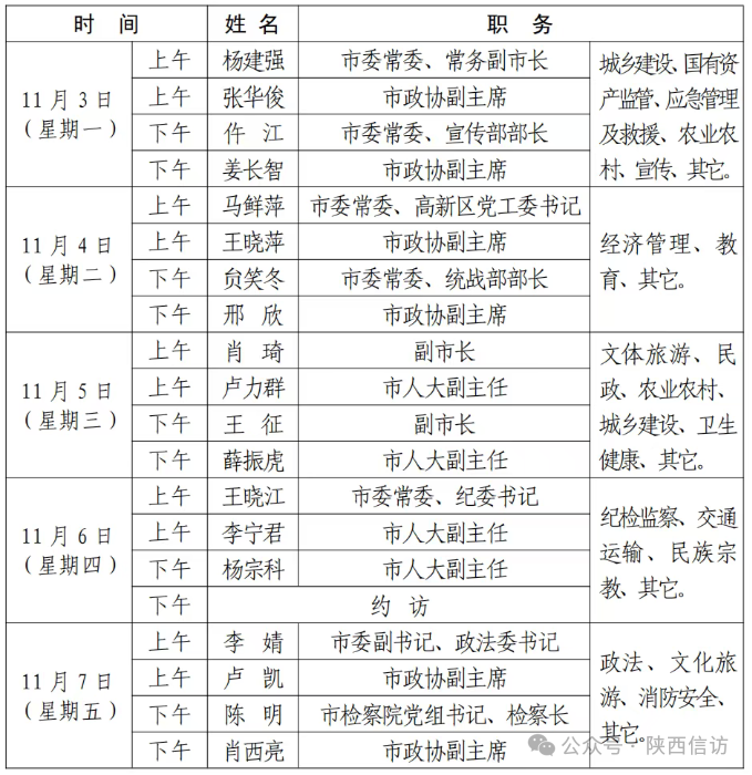 3.接访安排如因工作冲突等原因调整,具体接访领导以实际调整为准。