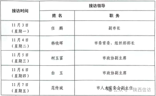 3.接访安排如因工作等原因调整,接访领导以实际调整后的为准;也可拨打电话预约领导接访,联系电话:0915-3215709