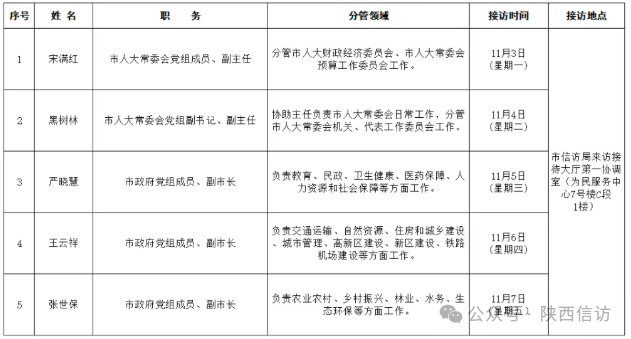 为进一步畅通信访渠道,方便人民群众及时就地反映诉求、解决问题,现将11月3日—7日延安市市级领导公开接访安排公布如下: