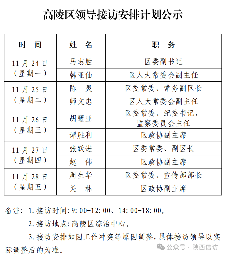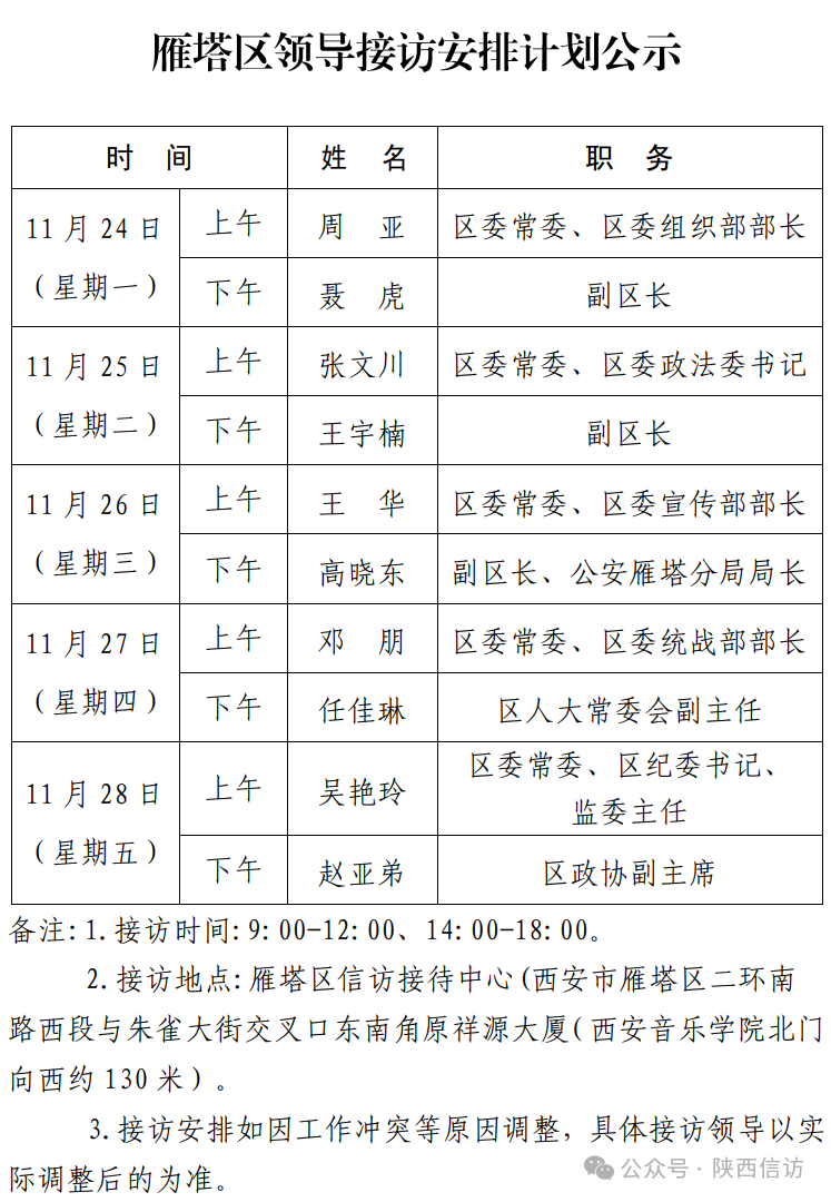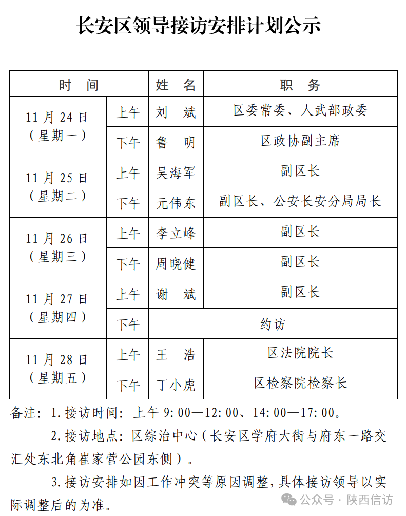 西安市各区县、西咸新区、开发区领导公开接访最新安排(11月24日—11月28日)