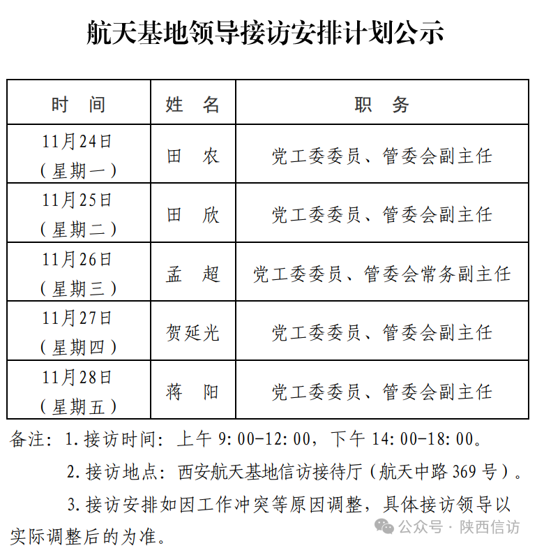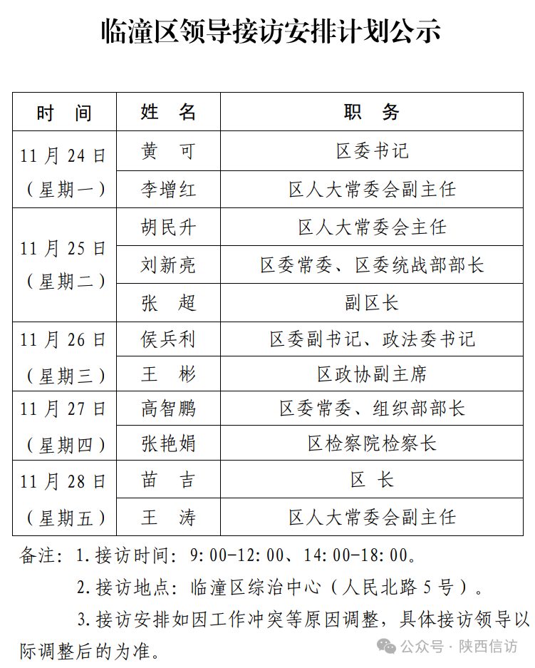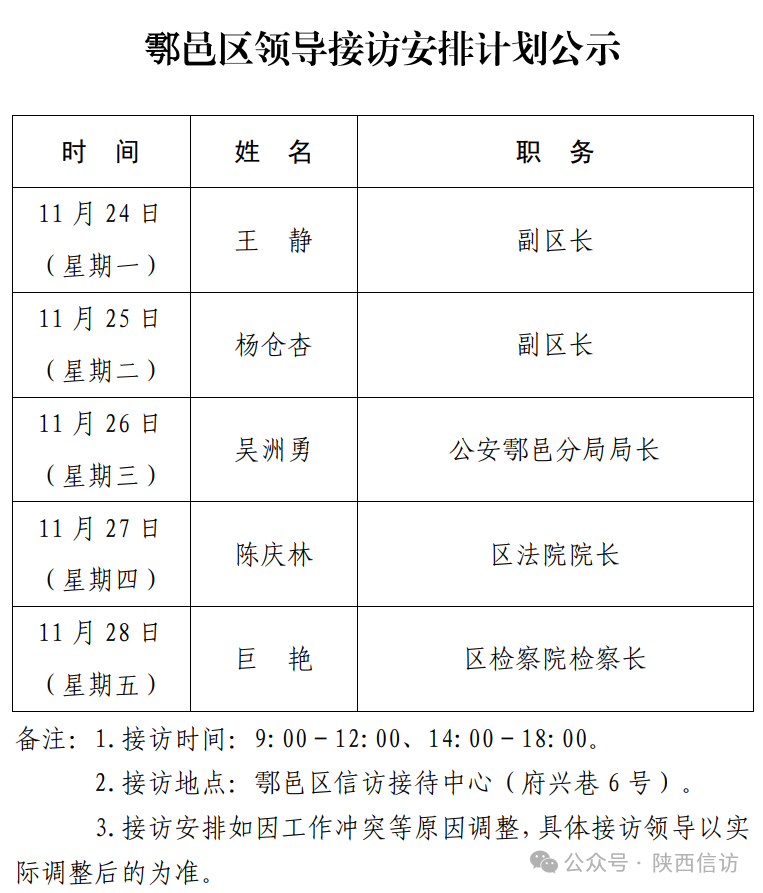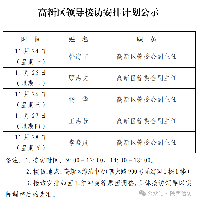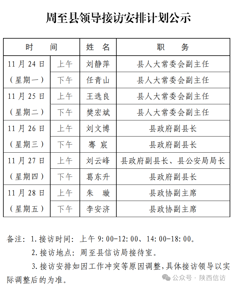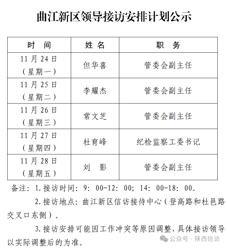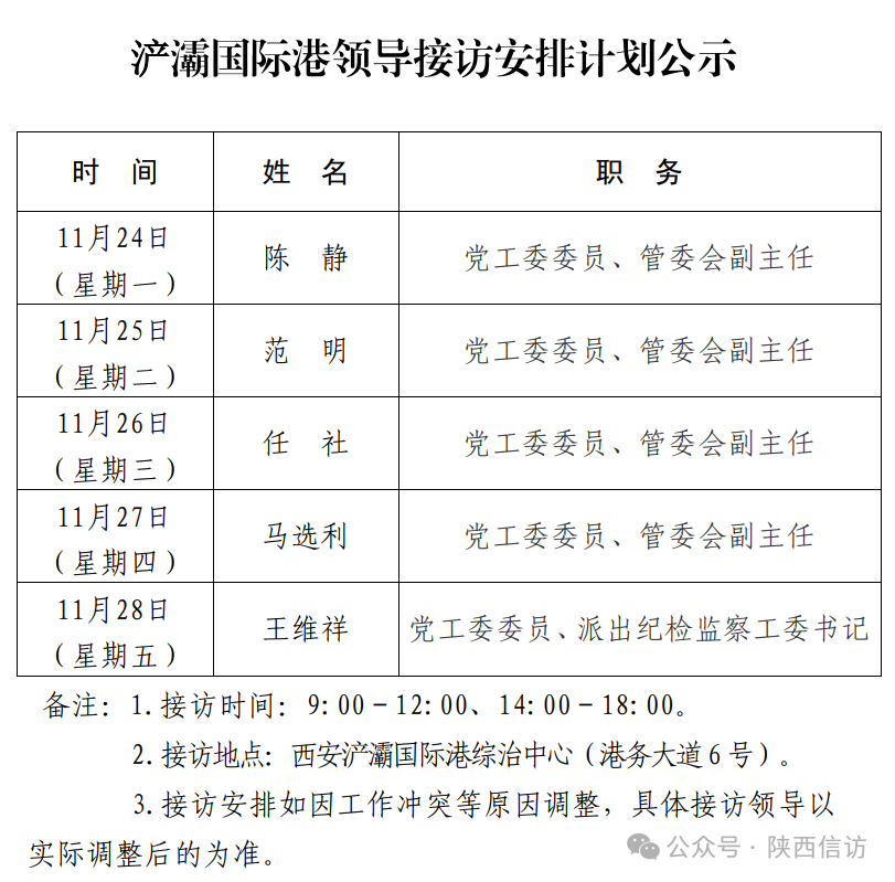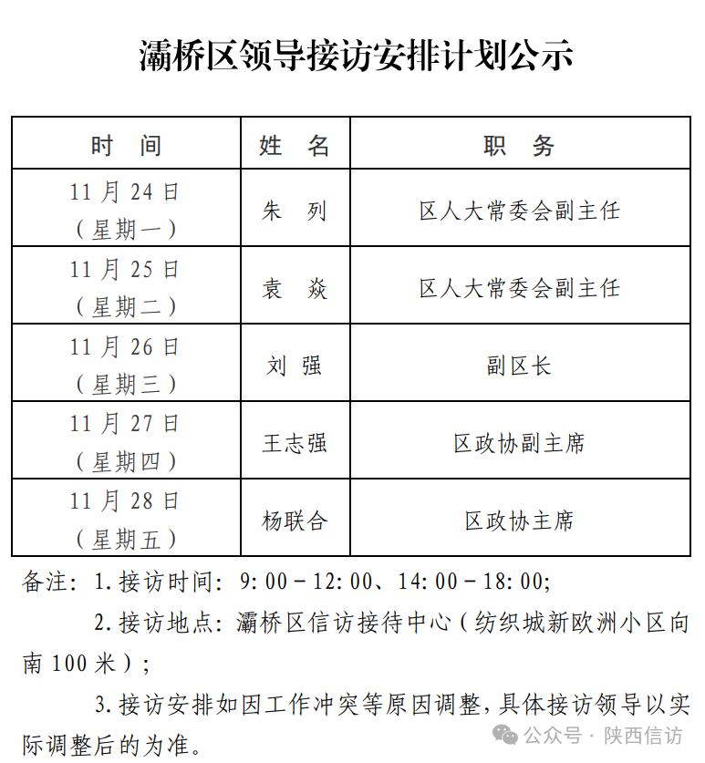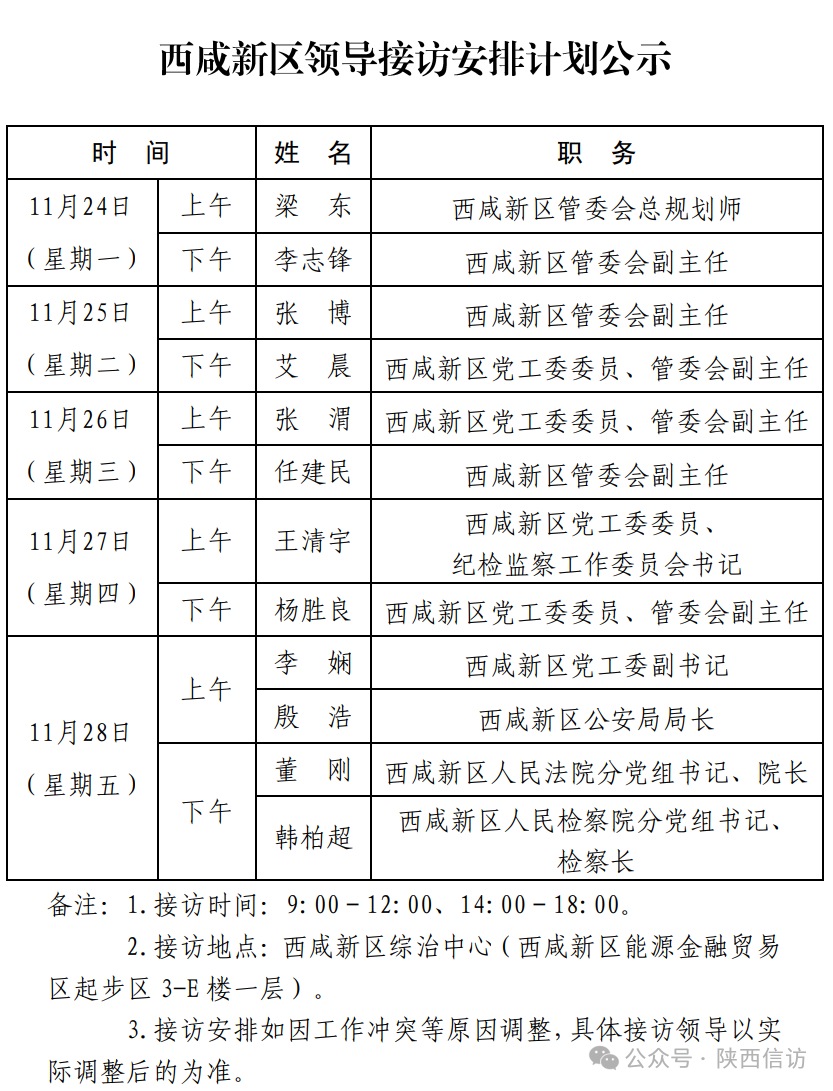 为进一步畅通信访渠道,方便人民群众及时就地反映诉求、解决问题,现将11月24日—11月28日西安市各区县、西咸新区、开发区领导接访安排计划公布如下: