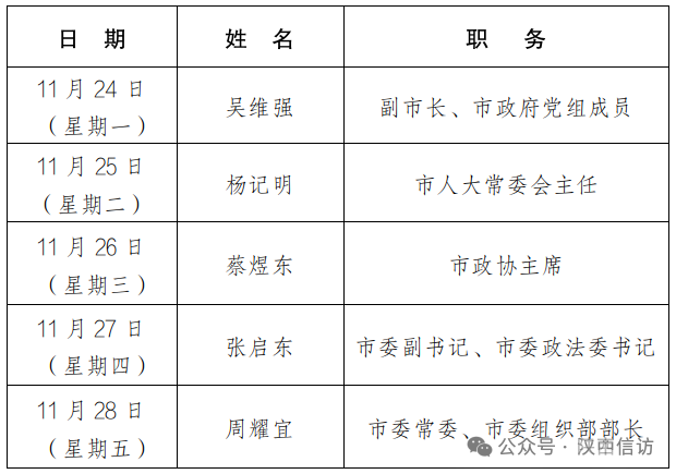 3.接访安排如因工作冲突等原因调整,具体接访领导以实际调整后的为准。