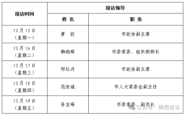 安康市市级领导公开接访最新安排(12月15日—12月19日)