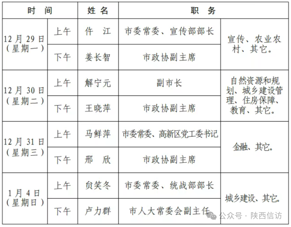 为进一步畅通信访渠道,方便人民群众及时就地反映诉求、解决问题,现将2025年12月29日-2026年1月4日西安市市级领导公开接访安排公布如下:
