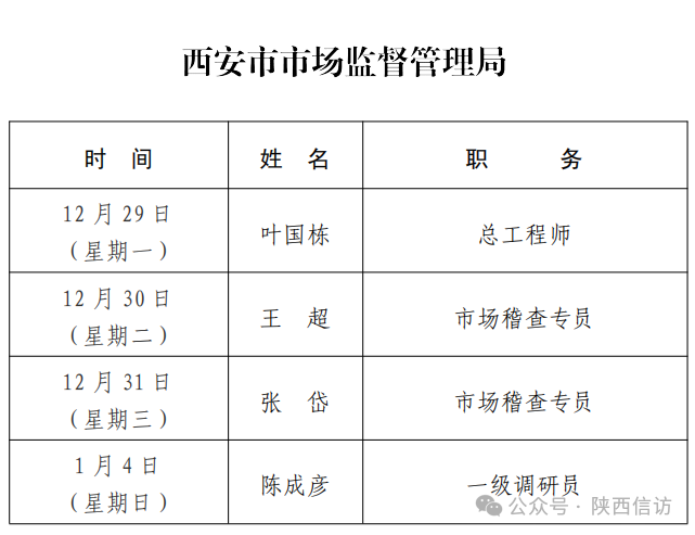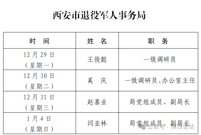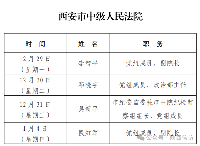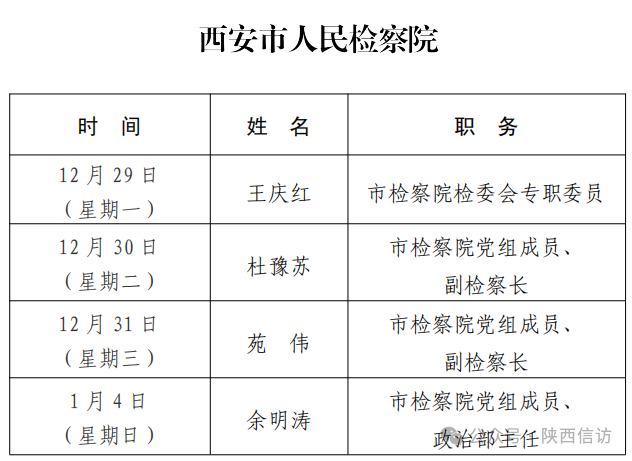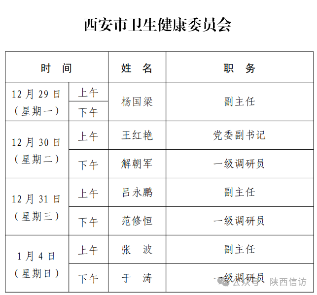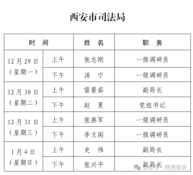 西安市驻信访接待中心市级部门领导接访最新安排(2025年12月29日-2026年1月4日)