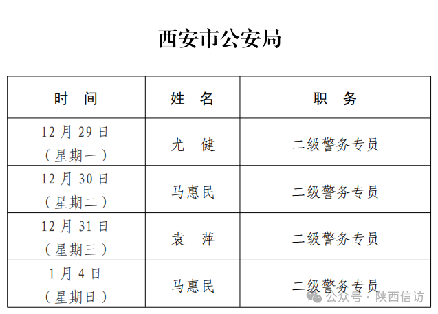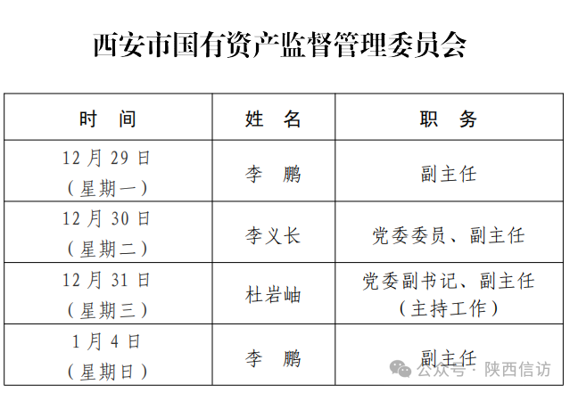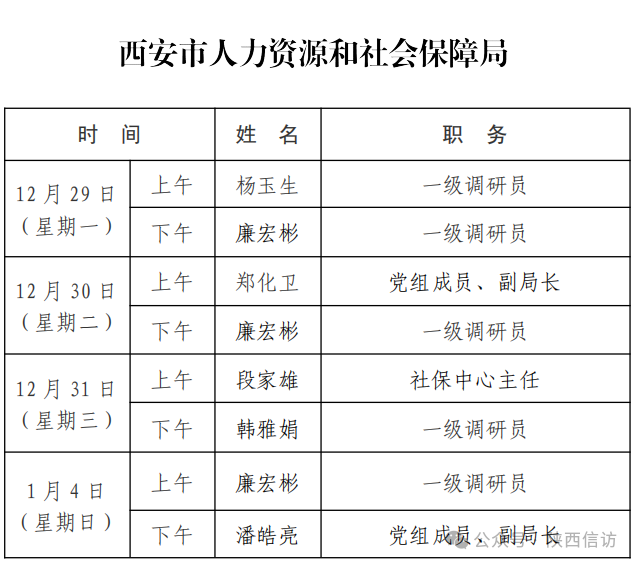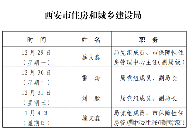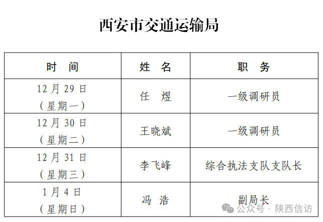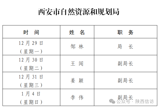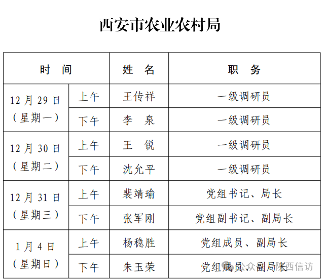 为进一步畅通信访渠道,方便人民群众及时就地反映诉求、解决问题,现将2025年12月29日-2026年1月4日西安市市级有关部门领导公开接访安排公布如下: