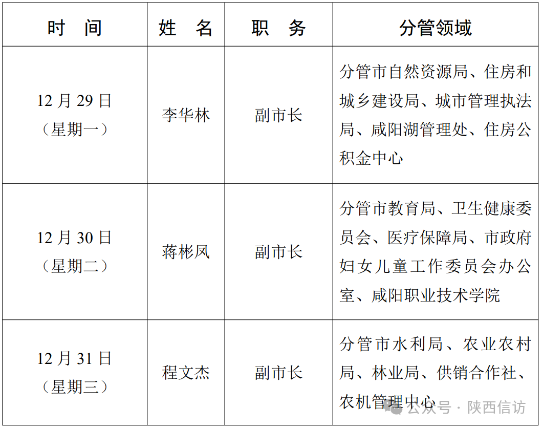 为进一步畅通信访渠道,方便人民群众及时就地反映诉求、解决问题,现将12月29日—12月31日咸阳市市级领导公开接访安排公布如下: