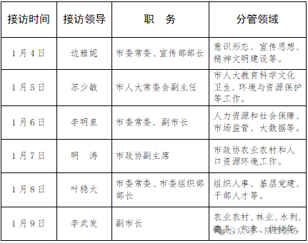 为进一步畅通信访渠道,方便人民群众及时就地反映诉求、解决问题,现将2026年1月4日—2026年1月9日市级领导公开接访安排公布如下: