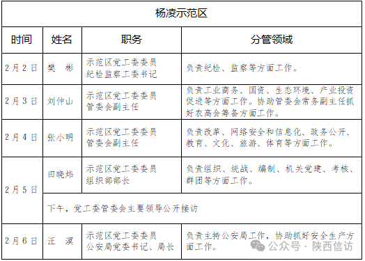 为进一步畅通信访渠道,方便人民群众及时就地反映诉求、解决问题,现将2月2日—2月6日杨凌示范区领导公开接访安排计划公布如下: