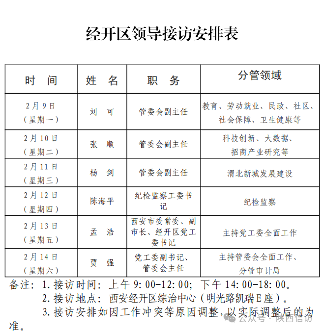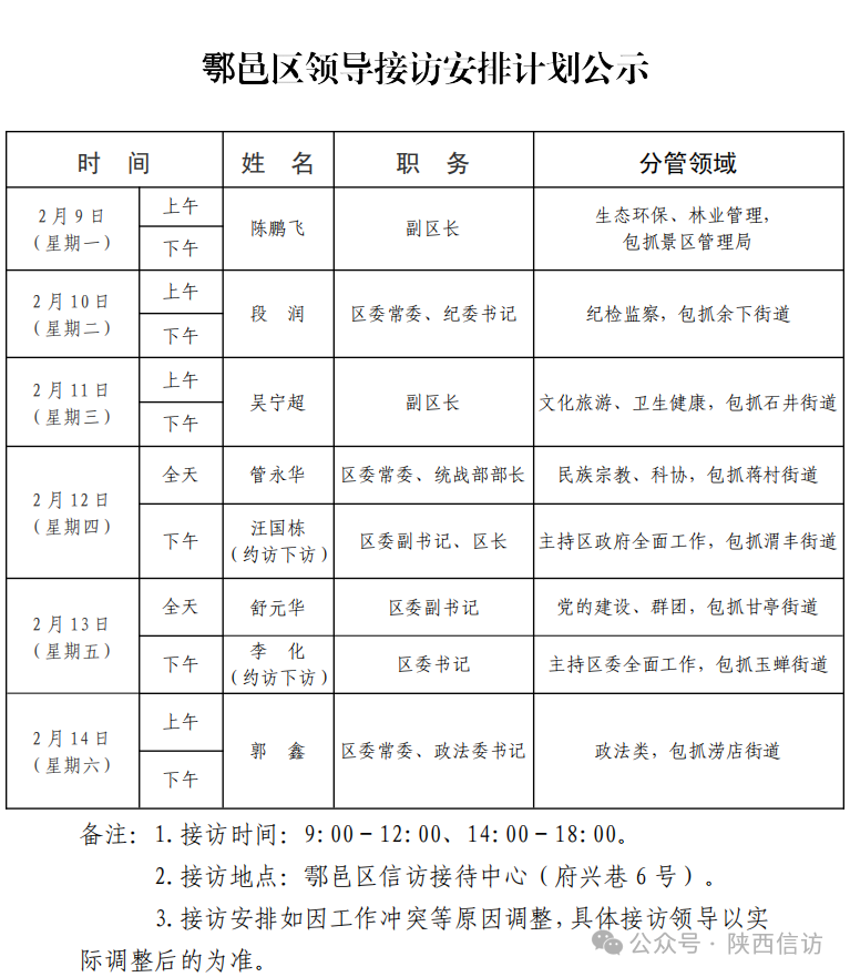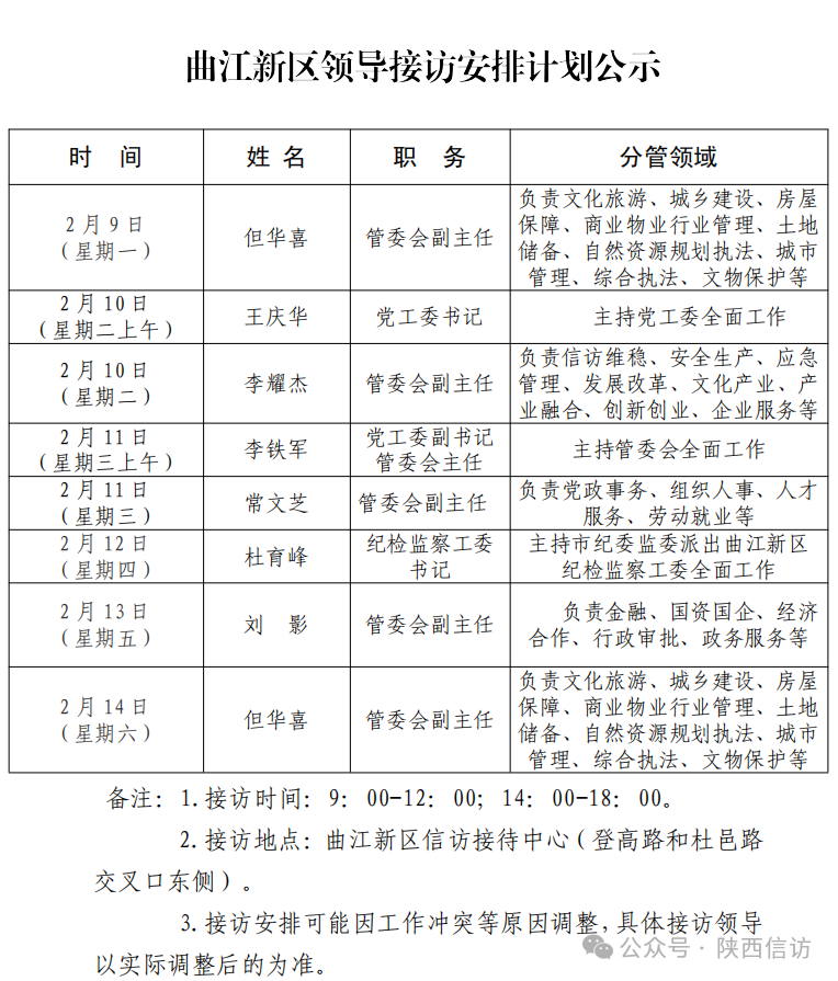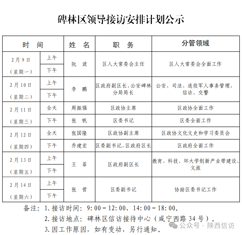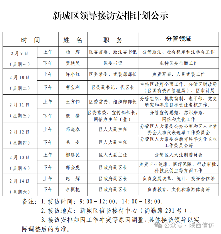 西安市各区县、西咸新区、开发区领导公开接访最新安排(2月9日—2月14日)