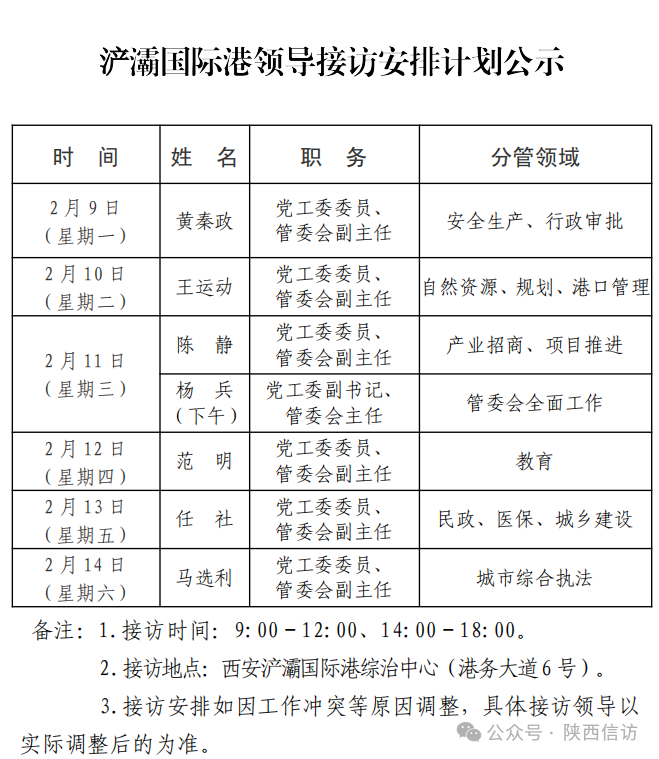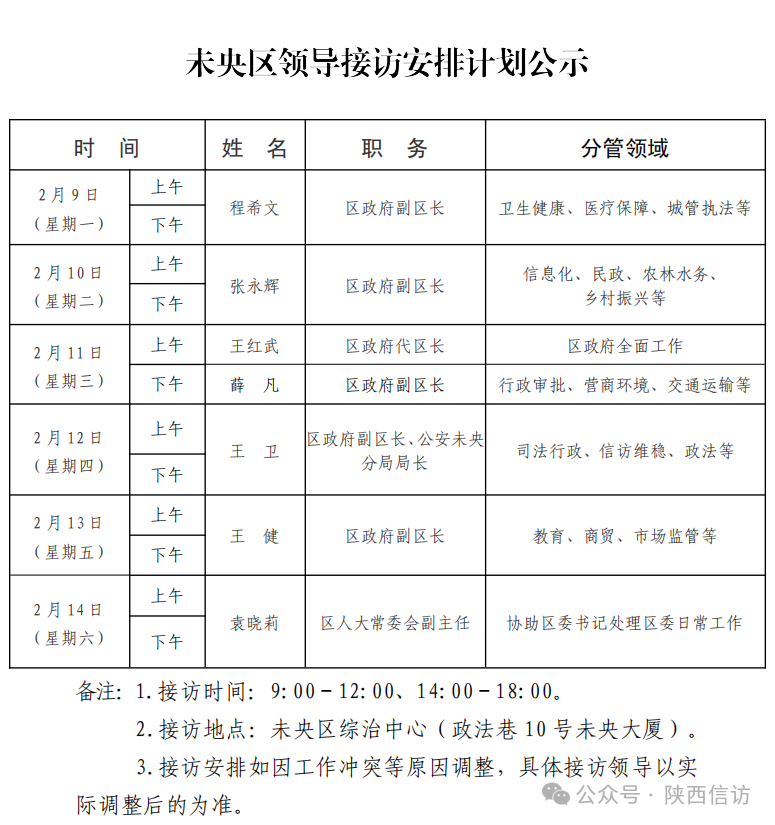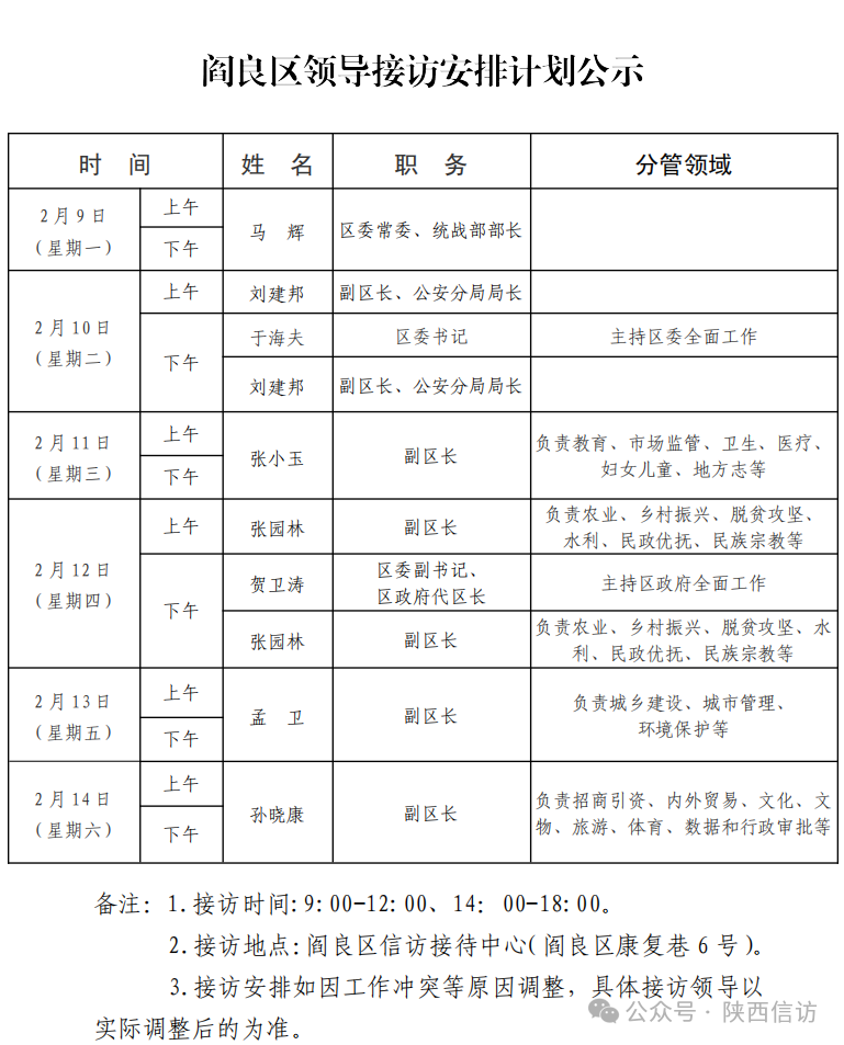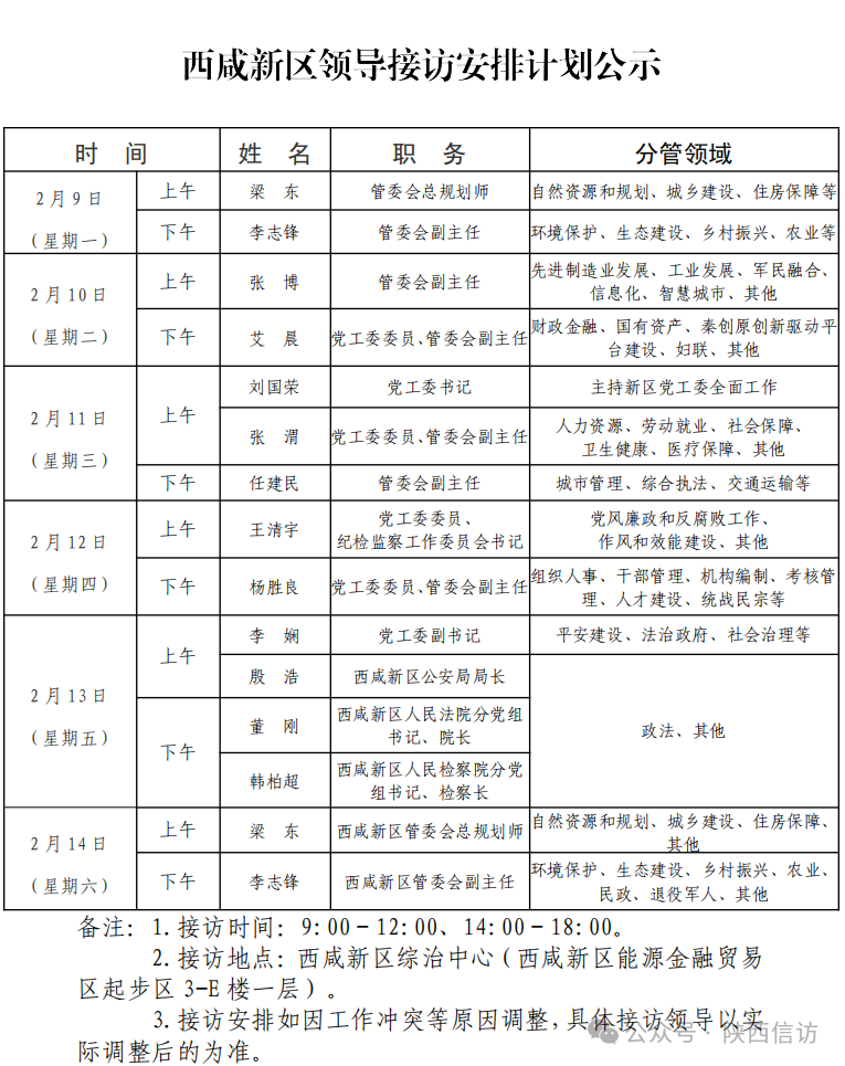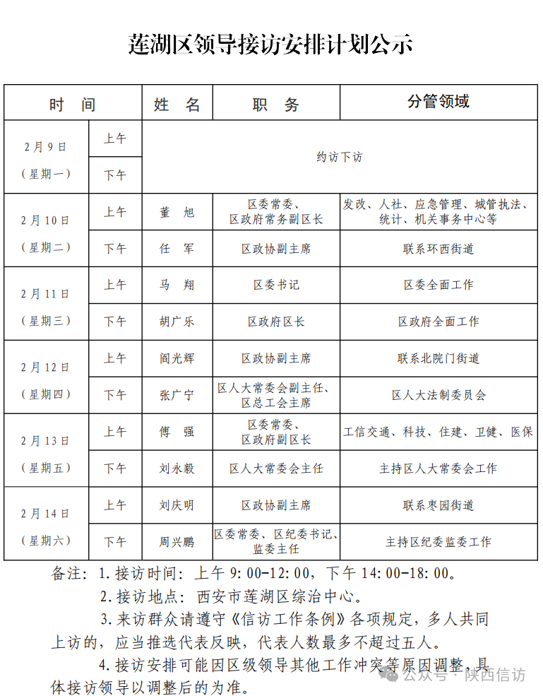 为进一步畅通信访渠道,方便人民群众及时就地反映诉求、解决问题,现将2月9日—2月14日西安市各区县、西咸新区、开发区领导接访安排公布如下:
