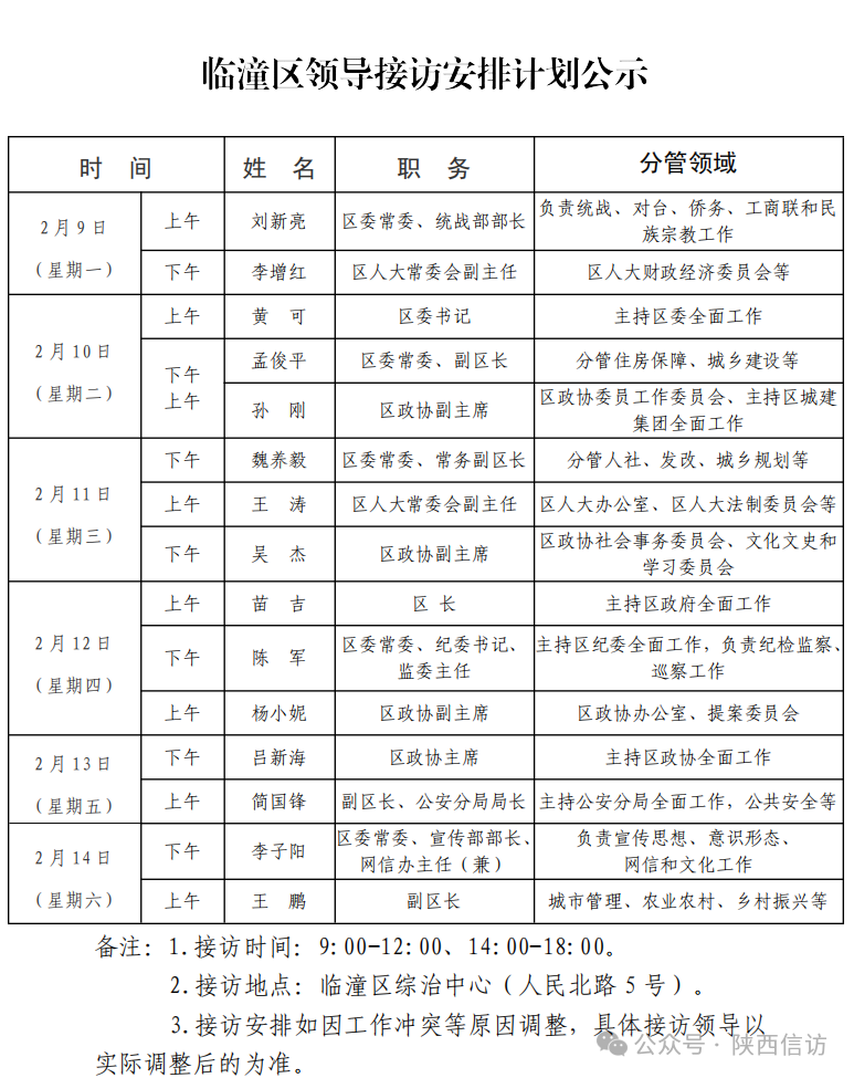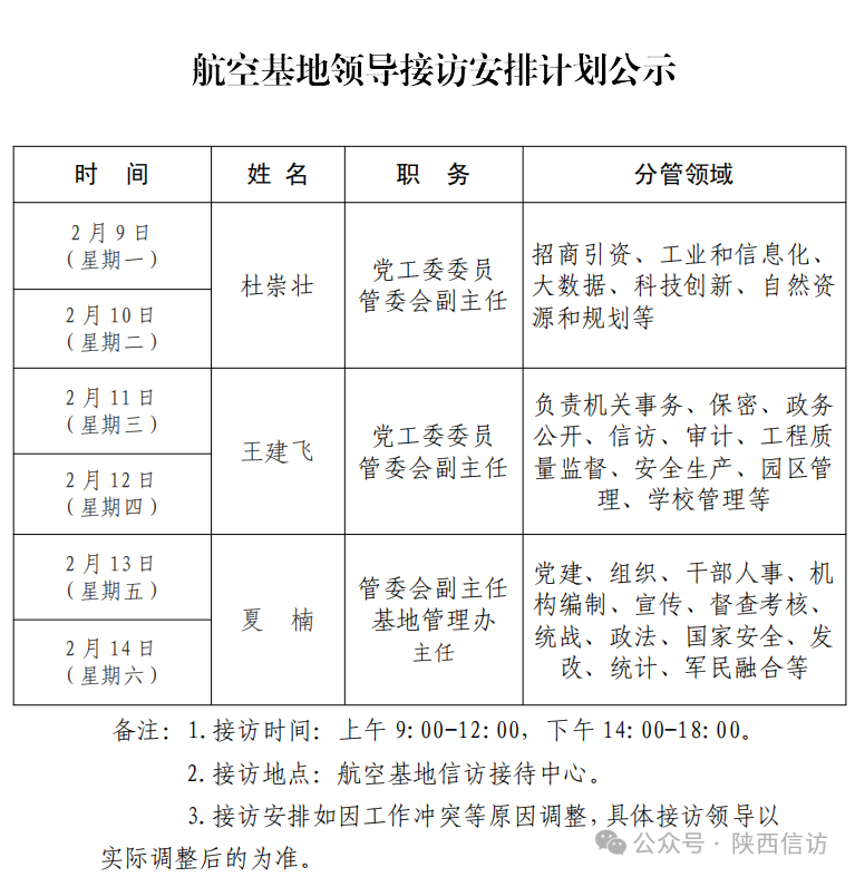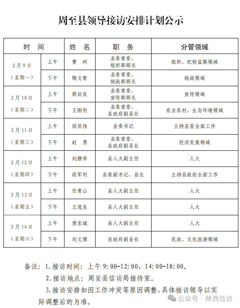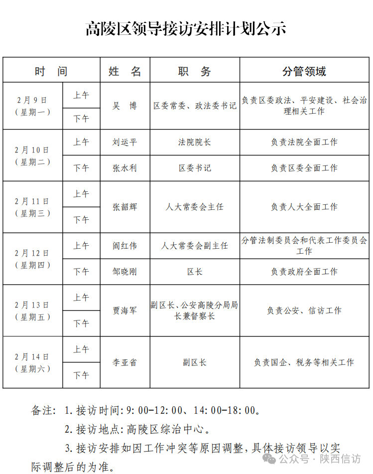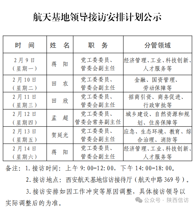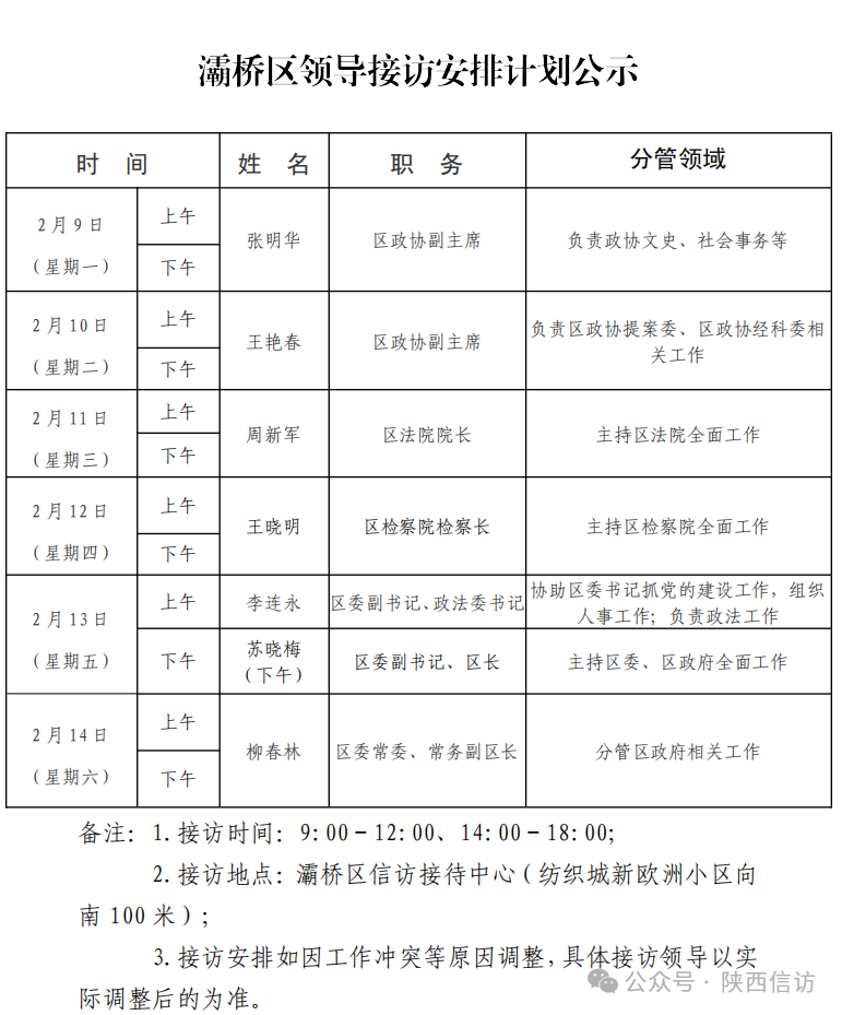 为进一步畅通信访渠道,方便人民群众及时就地反映诉求、解决问题,现将2月9日—2月14日西安市各区县、西咸新区、开发区领导接访安排公布如下: