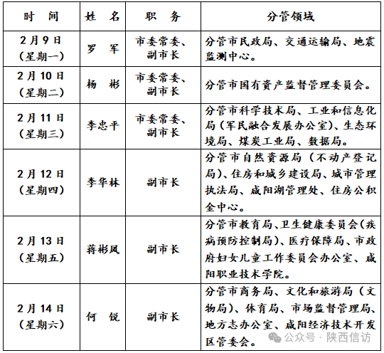 为进一步畅通信访渠道,方便人民群众及时就地反映诉求、解决问题,现将2月9日—2月14日咸阳市市级领导公开接访安排公布如下: