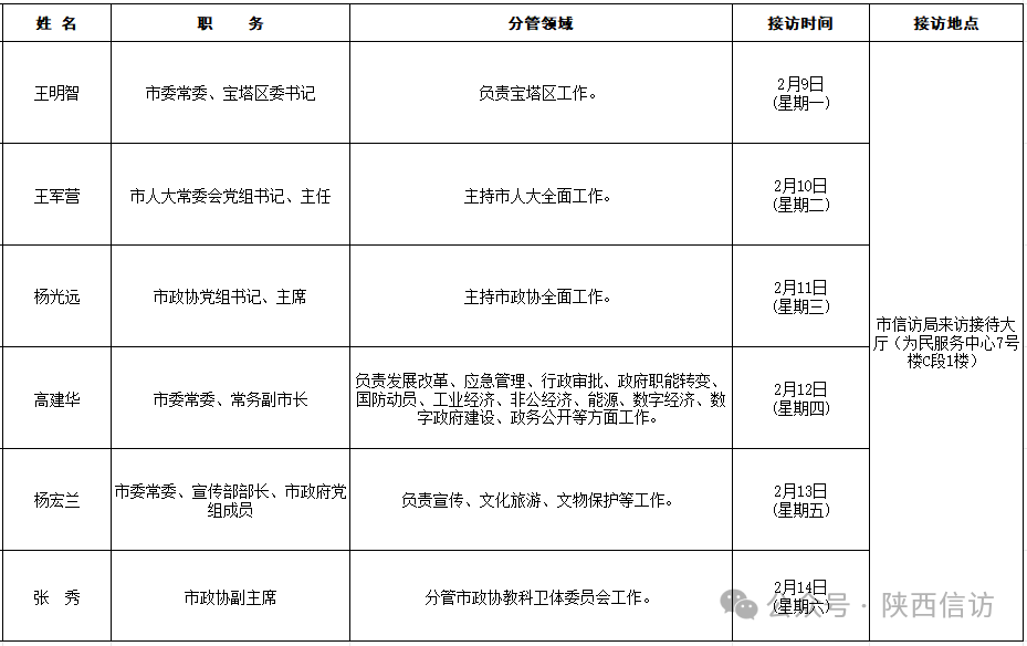 为进一步畅通信访渠道,方便人民群众及时就地反映诉求、解决问题,现将2月9日—2月14日延安市市级领导公开接访安排计划公布如下: