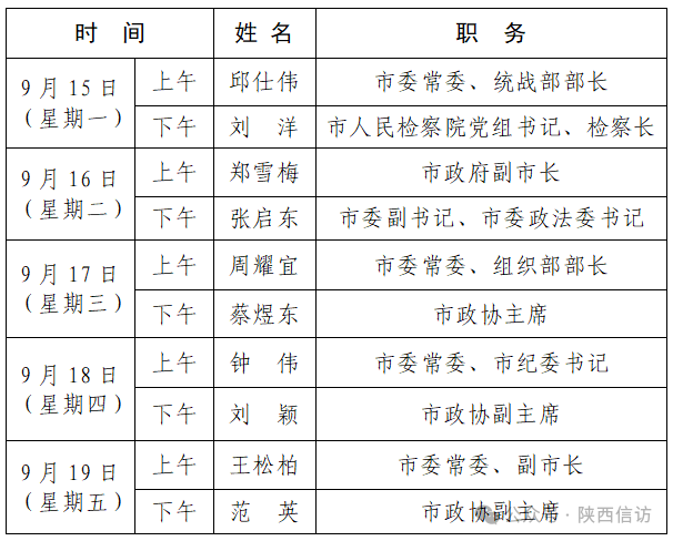 为进一步畅通信访渠道,方便人民群众及时就地反映诉求、解决问题,现将9月15日—19日市级领导在汉中市信访接待中心公开接访安排计划公布如下: